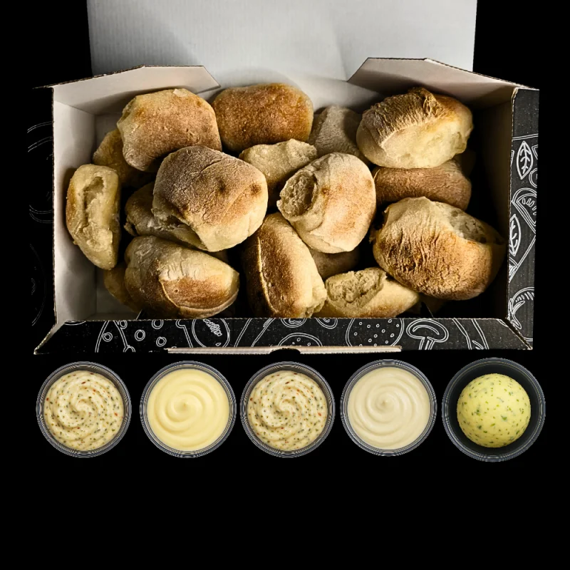 20 Pizzabrötchen mit 5 Dips nach Wahl!